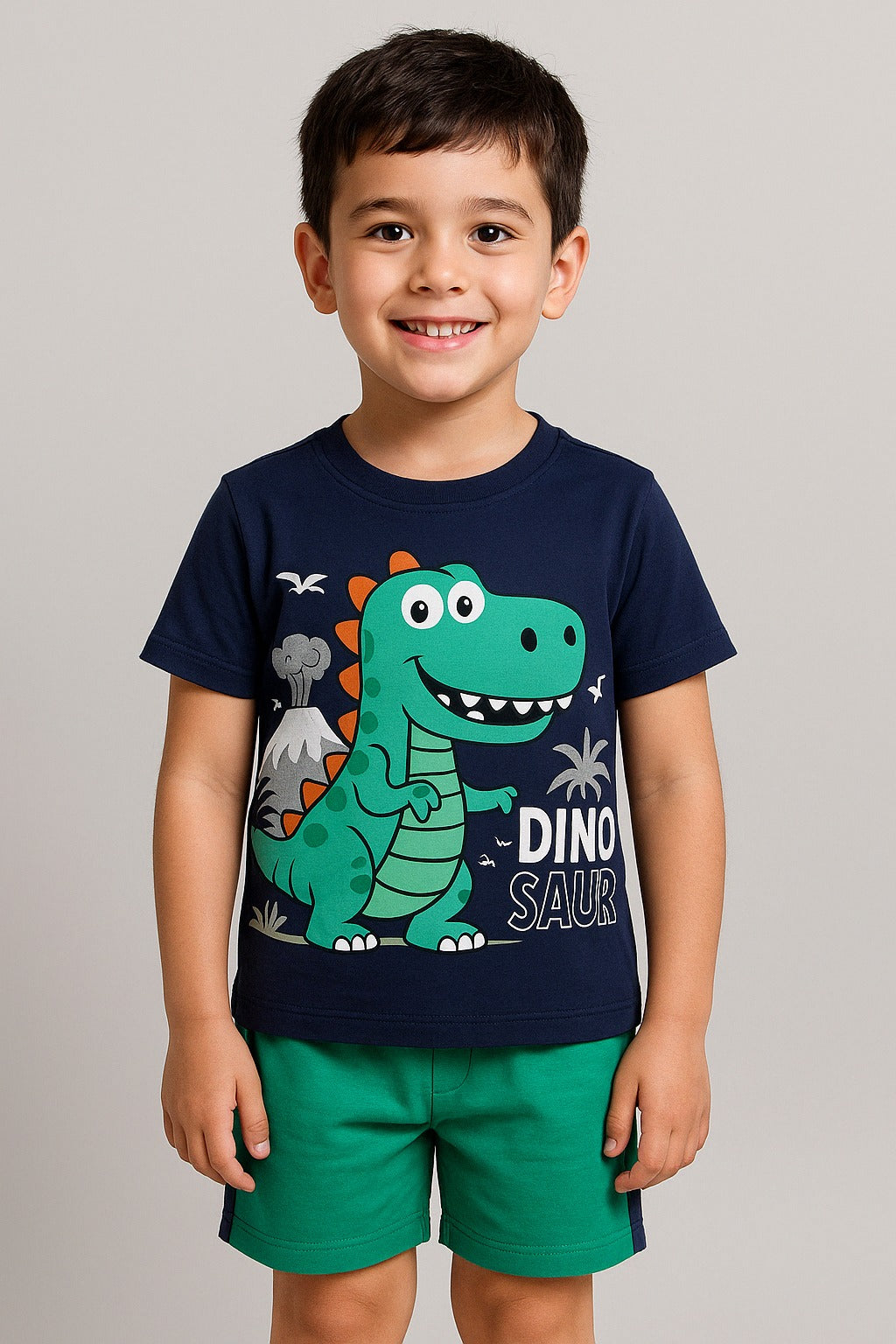 This set offers a balance of playful graphics and rich colour tones. The navy base enhances the dinosaur print, giving the outfit a stylish look. With breathable material, kids remain comfortable throughout warm weather.